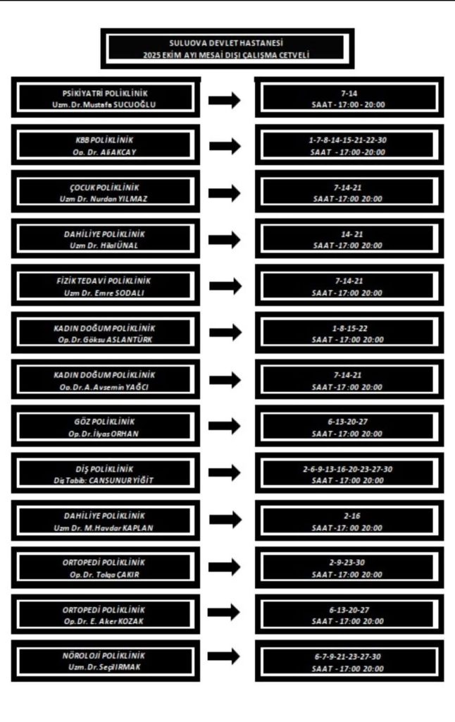 SULUOVA DEVLET HASTANESİ EKİM AYI MESAİ DIŞI UYGULAMA TAKVİMİ