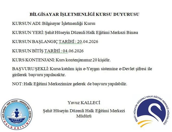 -Kurs kayıtları başlamış olup Başvurular e-Yaygın ve e-Devlet üzerinden veya Suluova Şehit Hüseyin Düzenli Halk Eğitim Merkezine şahsen yapılabilir.
