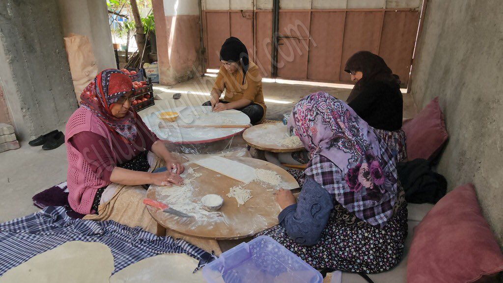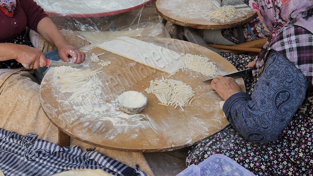 Türk mutfağına özgü, geleneksel yöntemlerle köy kuru yufkası, mantı, erişte ve makarna hazırlığı yapan kadınlar, evlerinin önünde kurdukları alanda önce hamuru hazırlıyor. Kıvama gelen hamuru belli ölçülerde böldükten sonra oklavalar ile düzgün bir daire şeklinde açarak inceltiyor, bıçakla belli kalıplara ayırdıktan sonra ise el ya da makine yardımıyla erişte, makarna ebatlarında keserek kurumaya bırakıyor. Kuruyan erişte ve makarnaları paketleyerek kullanıma hazır hale getirdikten sonra kış aylarında kullanmak üzere belli yerlerde muhafaza ediliyor.