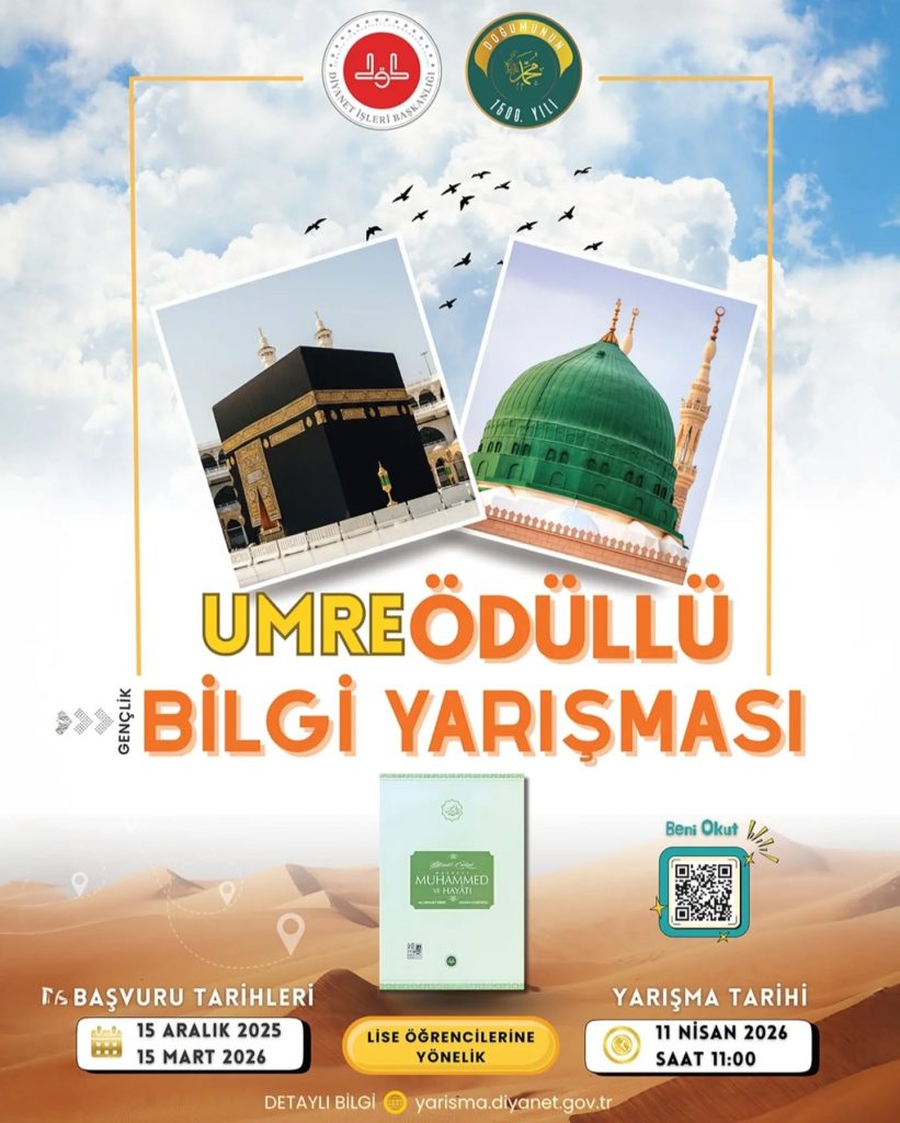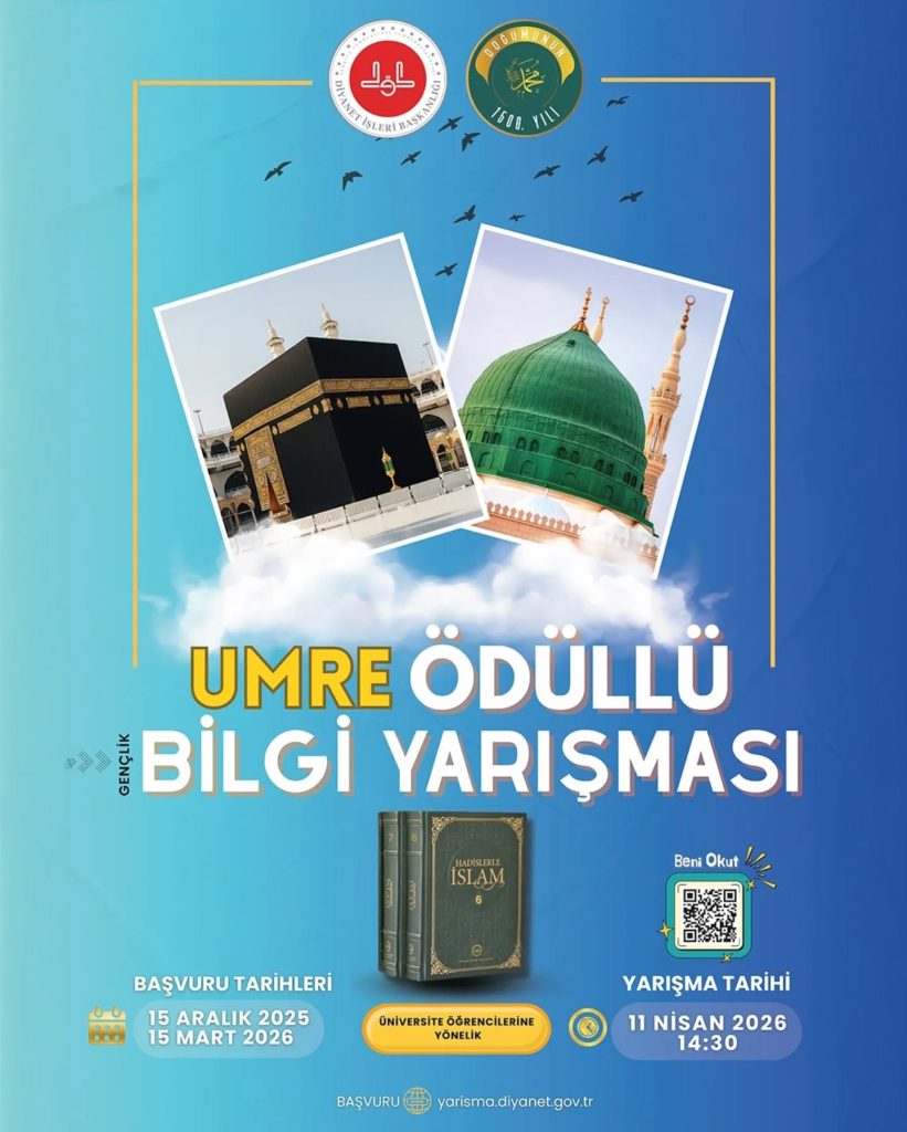 -Diyanet İşleri Başkanlığınca her yıl düzenlenen, Gençlerin sahih dinî bilgi ve manevi değerlerle donanacağı Umre Ödüllü Gençlik Bilgi Yarışması başvuruları 15 Aralık’ta başlıyor.