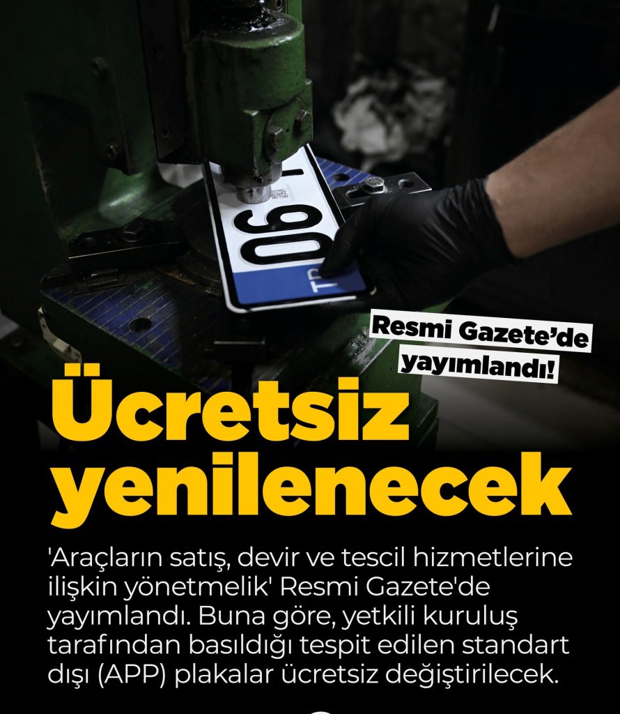 -Resmi Gazete’de yayımlanan düzenlemeyle standart dışı araç plakalarının ücretsiz şekilde değiştirileceği açıklandı.