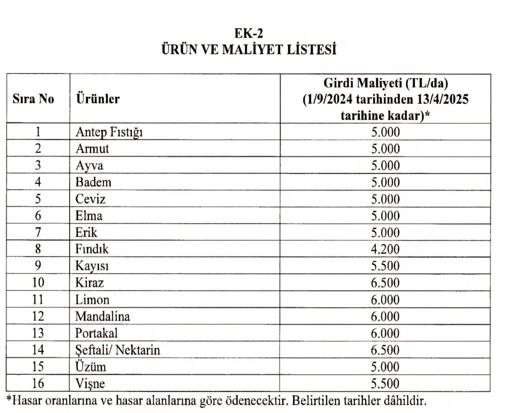 1 Şubat -13 Nisan 2025 tarihleri arasında ürünleri yüzde 20 ve üzeri hasar gördüğü tespit edilen çiftçilerimizin 1 Eylül 2024 tarihinden 13 Nisan 2025 tarihine kadar (bu tarihler dâhil) gerçekleşen girdi maliyetleri, 2025 üretim yılı için 13.04.2025 tarihine kadar ( bu tarih dahil ) CKS kayıtları olan üreticilere bu kayıtlar esas alınarak hasarları olan ve bu hasarlar için müracaat eden Tarım İl ve İlçe Müdürlüklerince tespit edilen tarm sigortası yaptırmamış çiftçiler, tarım sigortası olup don teminatı olmayan çiftçiler, yararlanacaktır.