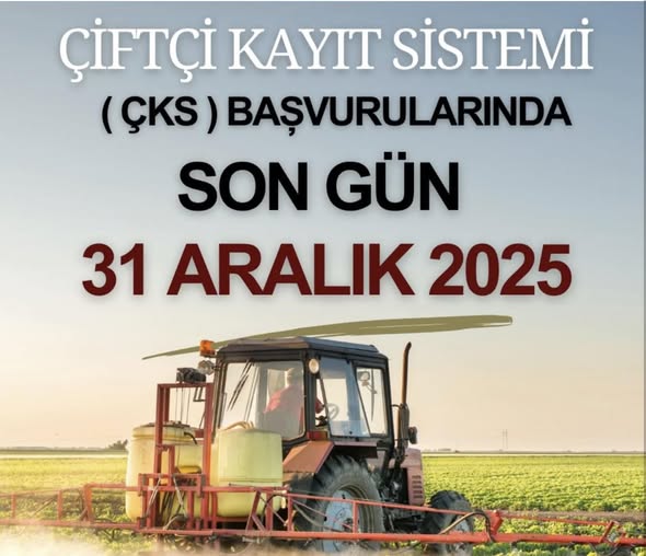 -2026 ÜRETİM YILI ÇİFTÇİ KAYIT SİSTEMİ ( CKS )BAŞVURU İŞLEMLERİ 1 EYLÜL 2025 TARİHİNDE BAŞLAMIŞ OLUP 31 ARALIK 2025 ÇARŞAMBA GÜNÜ SONA ERECEKTİR.