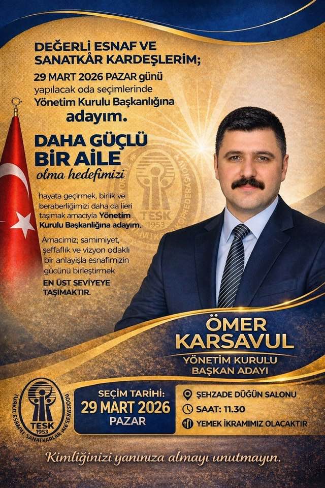 Ömer Karsavul; “29 Mart 2026 Pazar günü(yarın) saat:11.30’da Şehzade Düğün Salonunda yapılacak oda seçimlerimize katılımlarınız ve destekleriniz için teşekkür ediyor, sağlıklı gün ve bereketli kazançlar diliyorum.” Dedi.