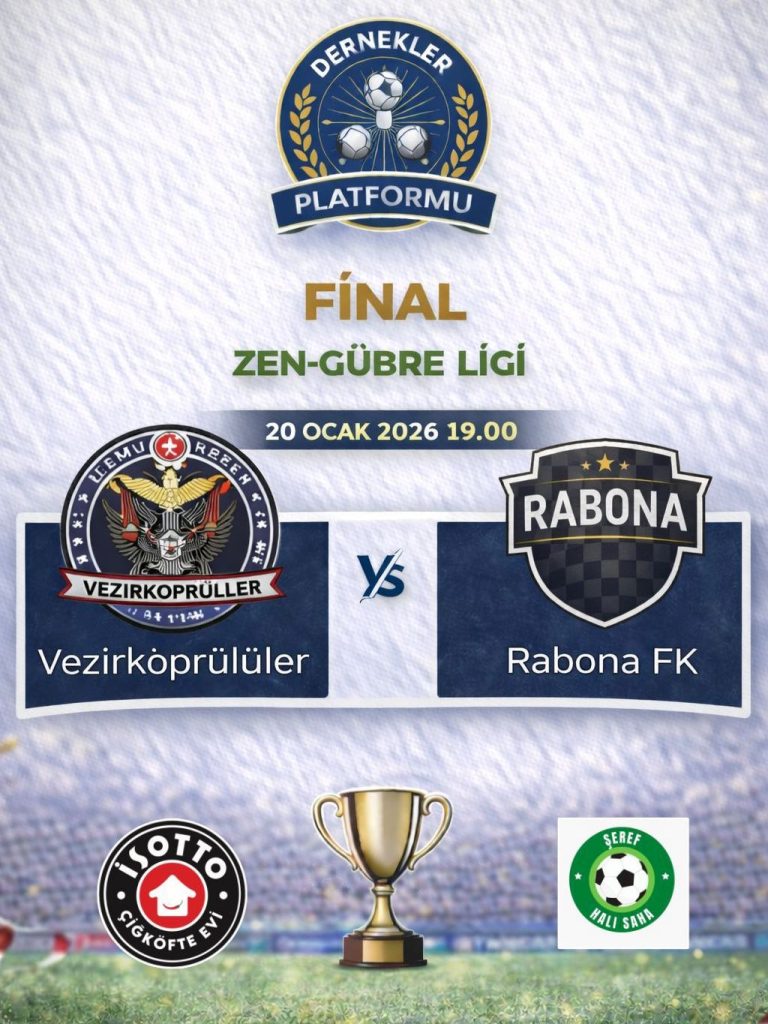 -Suluova Dernekler Platformunun düzenlediği kurumlar arası futbol turnuvasında Vezirköprülüler futbol kulübü ile Rabona futbol kulübü arasında oynanacak olan final maçı Salı günü Saat: 19.00 da Şeref Halı Saha Spor Kompleksinde oynanacaktır.