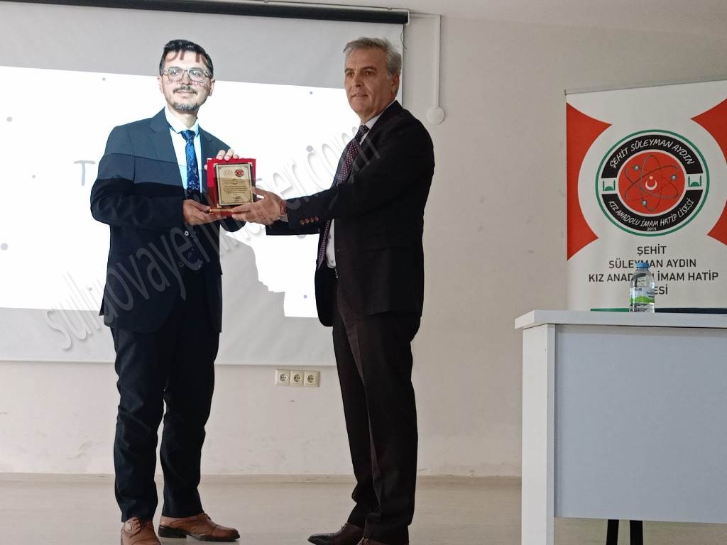 Konferans sonunda İlçe Milli Eğitim Müdürü Ahmet Davu tarafından konferansı veren Amasya Üniversitesi İlahiyat Fakültesi Öğretim Üyesi Doç. Dr. İlyas Uçar’a plaket takdim ederek teşekkür etti.