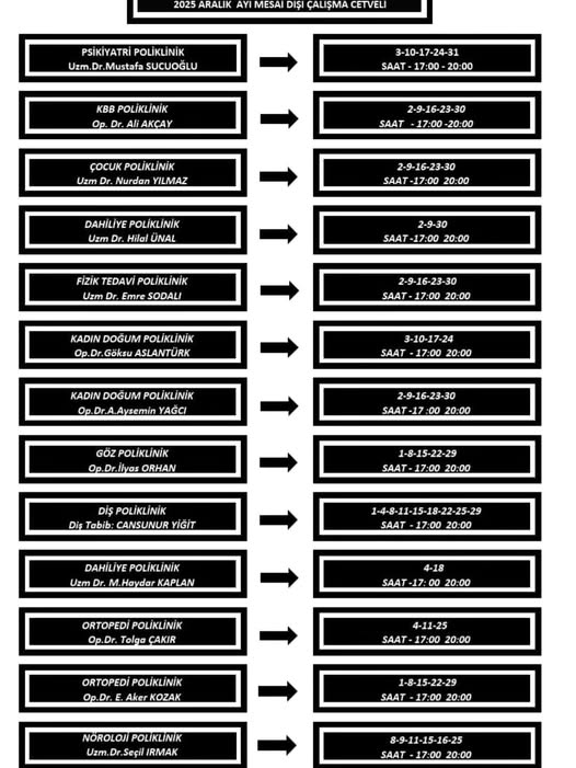 SULUOVA DEVLET HASTANESİ ARALIK AYI MESAİ DIŞI UYGULAMA TAKVİMİ