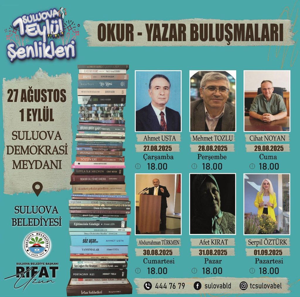 -Suluova Belediyesi tarafından, 27 Ağustos–1 Eylül tarihleri arasında gerçekleştirilecek olan “Bir Eylül Kültür ve Sanat Şenlikleri” kapsamında düzenlenen ‘Okur-Yazar Buluşmaları’ etkinliğinde, ilçemizin değerli şair ve yazarları Demokrasi Meydanı’nda okurlarıyla buluşuyor.