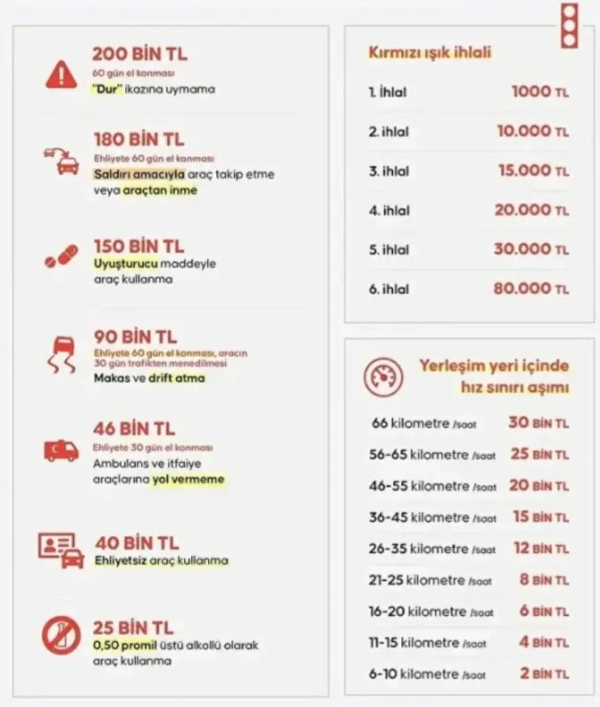 Yeni düzenlemeyle trafik cezalarında tarihi artışlara gidilirken; trafikte saldırgan sürüş, çakar kullanımı, sahte plaka, ehliyetsiz araç kullanma ve sosyal medyada kural ihlallerini övme gibi suçlara ağır yaptırımlar getirildi.