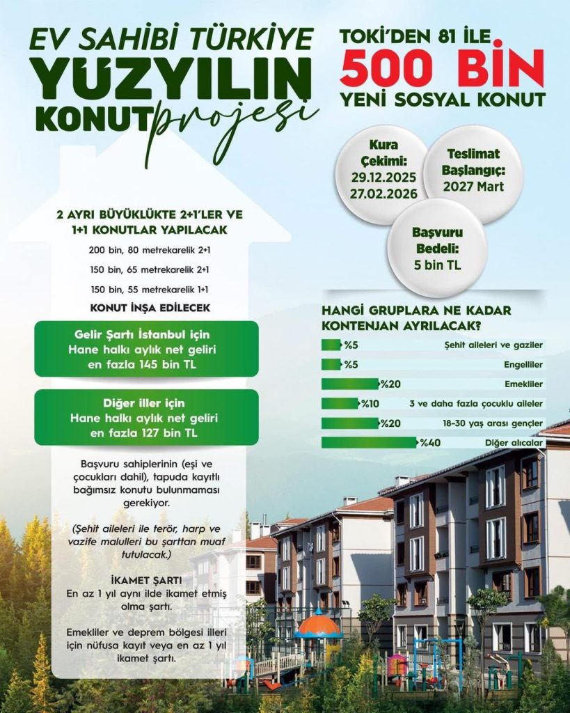 -81 ilde dar gelirli vatandaşlar için uygun koşullarda 500 bin sosyal konutun satışa sunulacağı bu proje için başvurular 10 Kasım 2025 – 19 Aralık 2025 arasında toplanacak. İnşa ve ihale süreci 2025 Kasım itibarıyla başlayacak. Hak Sahibi Belirleme Kuraları, 29 Aralık 2025 – 27 Şubat 2026 tarihleri arasında gerçekleştirilecek. Teslimatların ise 2027 Mart itibarıyla başlaması planlanıyor.